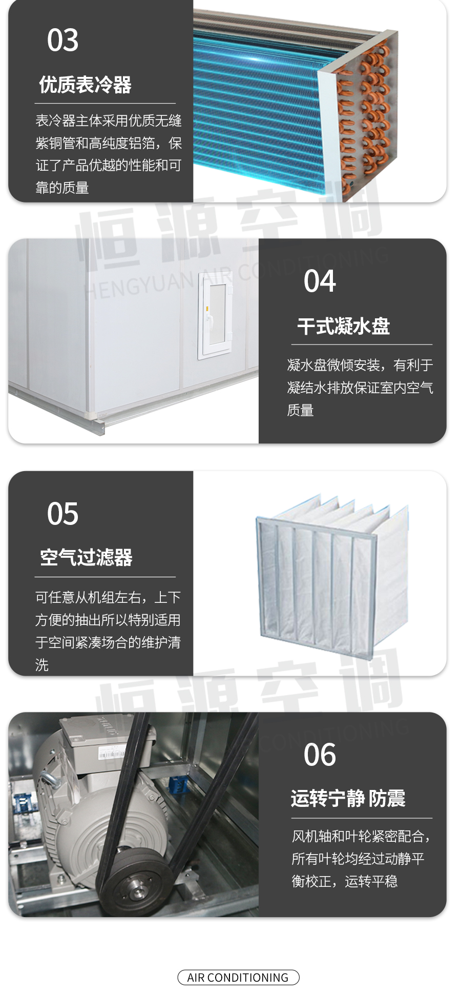 靖江市恒源空調(diào)設(shè)備制造有限公司——組合式空調(diào)機(jī)組是由各種空氣處理功能段組裝而成的一種空氣處理設(shè)備。適用于阻力大于100Pa的空調(diào)系統(tǒng)。 機(jī)組空氣處理功能段有空氣混合、均流、過濾、冷卻、一次和二次加熱、去濕、加濕、送風(fēng)機(jī)、回風(fēng)機(jī)、噴水、消聲、熱回收等單元體。